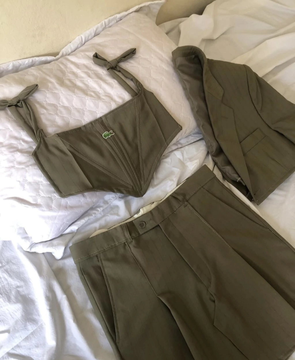 O conjunto é composto por três peças, corset, saia e blazer cropped. As peças são upcycling feitas à mão. O corset possui duas regulagens, no ombro e nas costas com fitas.