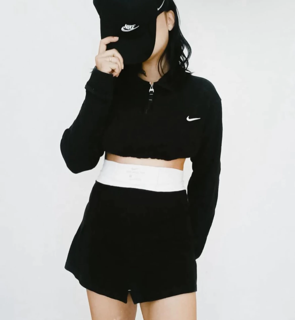 Conjunto Nike Upcycling. O conjunto é composto por uma saia de pregas e uma polo manga longa.