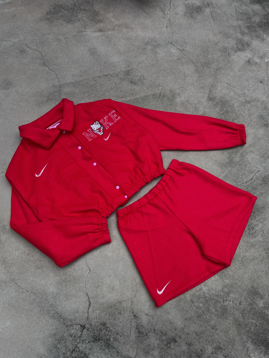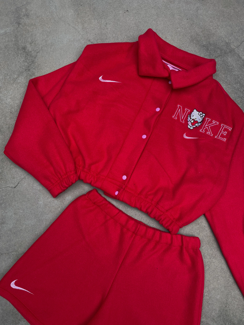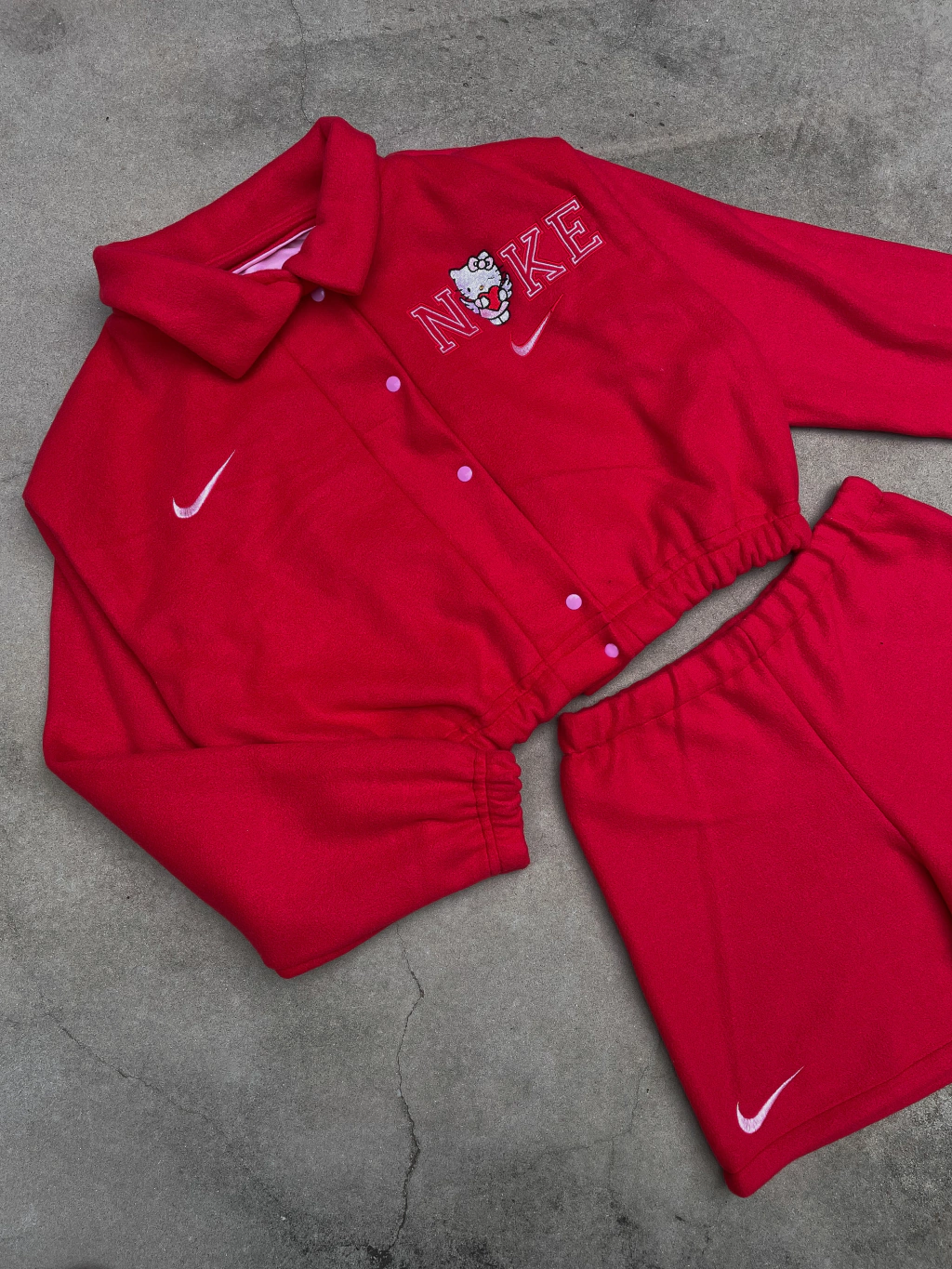 Conheça o Conjunto Nike x Hello Kitty, uma peça autoral feita em tecido soft com forro rosa, perfeita para quem busca conforto e estilo. O fechamento em botões garante praticidade e um toque delicado ao look. Ideal para momentos casuais com um design exclusivo.
