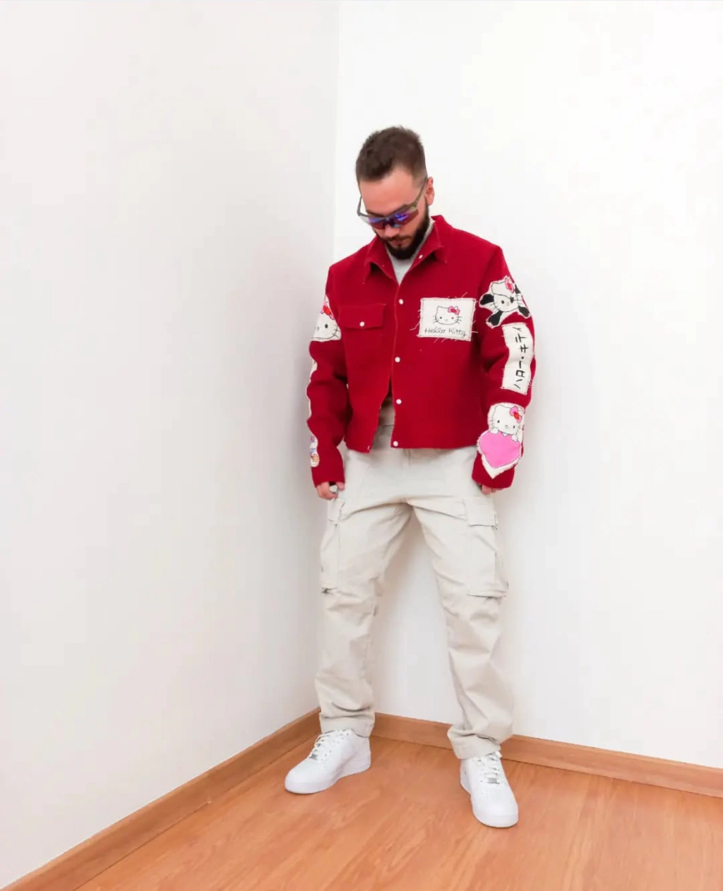 Jaqueta Hello Kitty Autoral, uma peça única feita de soft com forro e fechamento em botões. Os desenhos são confeccionados à mão, trazendo um toque exclusivo e artesanal.