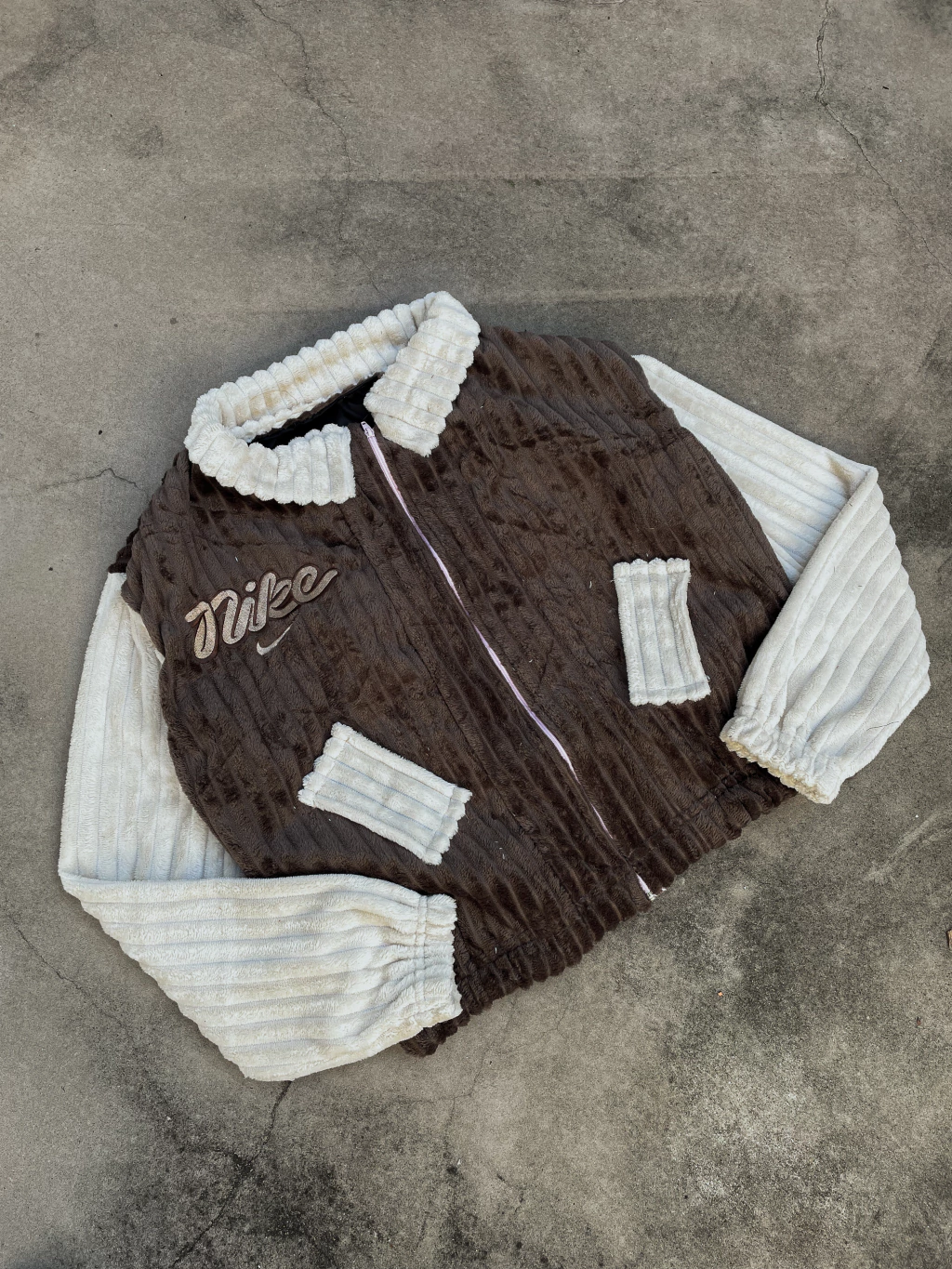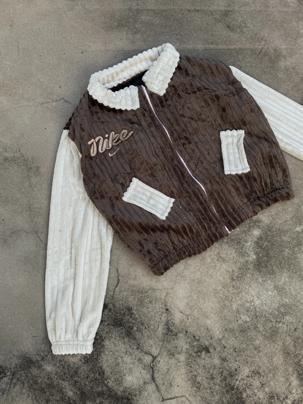 A Jaqueta Upcycling Nike, com bolsos decorativos, fechamento em ziper e um forro confortável.