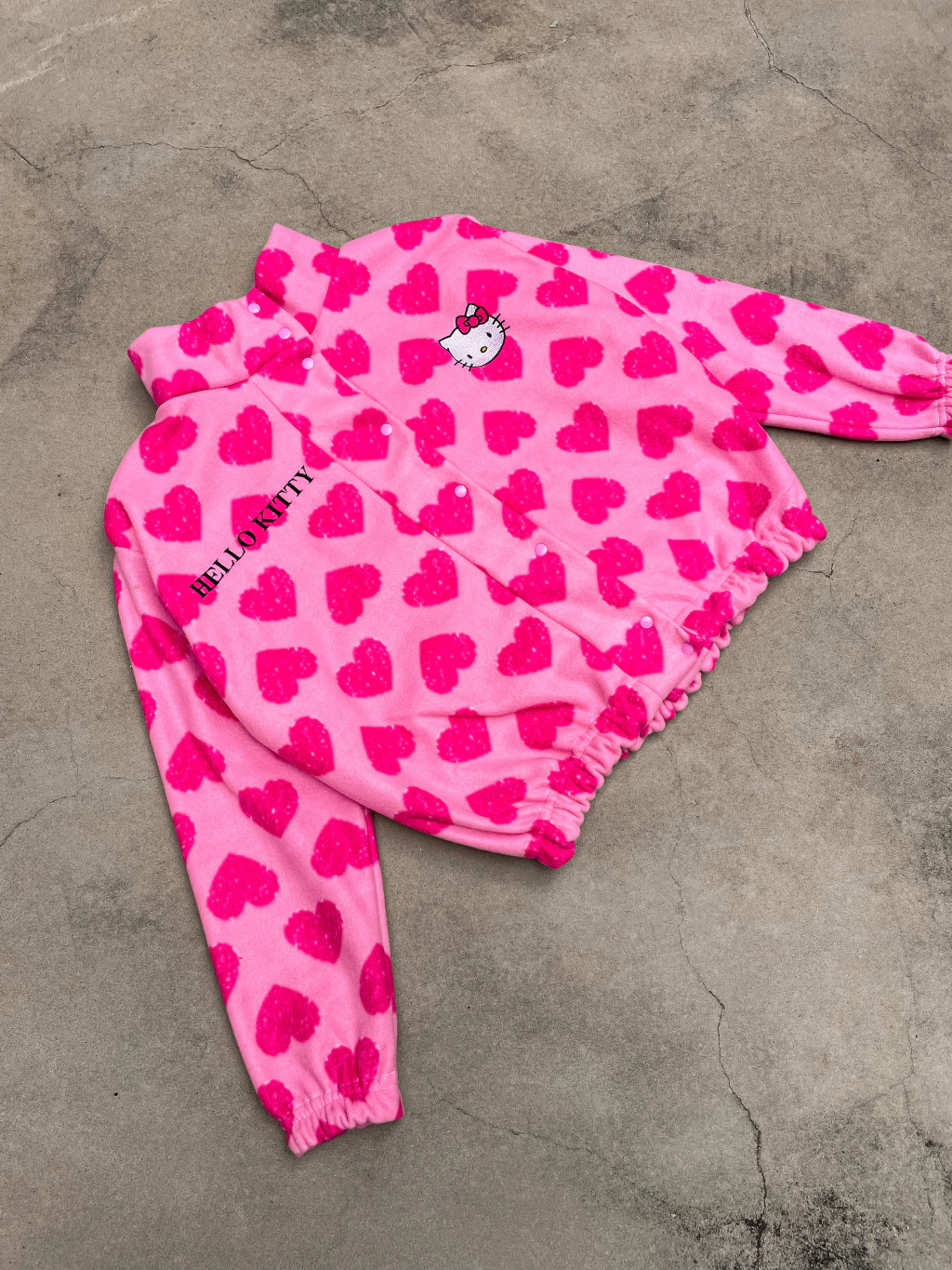 Descubra a jaqueta Upcycling Hello Kitty, uma peça autoral. Feita com materiais reaproveitados, possui forrinho rosa que traz conforto e charme. O fechamento é em botões, garantindo praticidade e um toque vintage. Feita em soft, fofinha e quentinha 🩷